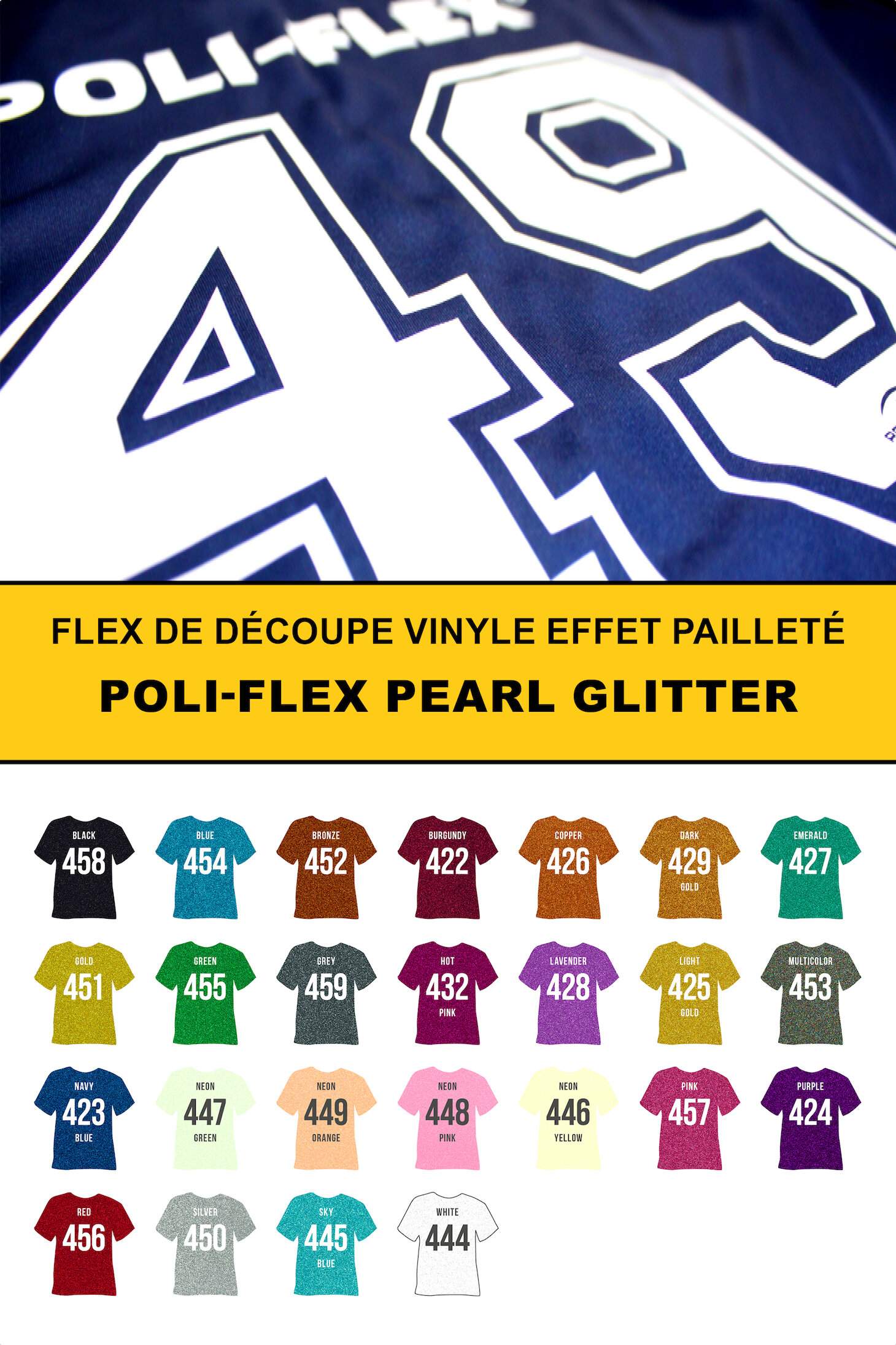Adhesive glitter effect vinyl cutting flex. Heat-bonded copolyester / thickness [mm]: 0.34 +/- 10 % / coating: PET film, self-adhesive. Transfer conditions: temperature: 160 °C / pressure: 2.5 bar [medium pressure] / time: 15 sec. Washing: 60 °C / clean inside out / suitable for machine drying. Technical details in the PDF file. Features: - Manufacturer: POLI-TAPE - 1 size(s) to choose from: 1mx50cm - 25 color(s) : pearl_glitter_black - pearl_glitter_blue - pearl_glitter_bronze - pearl_glitter_burgundy - pearl_glitter_copper - pearl_glitter_dark_gold - pearl_glitter_emerald - pearl_glitter_gold - pearl_glitter_green - pearl_glitter_grey - pearl_glitter_hot_pink - pearl_glitter_lavender - pearl_glitter_light_gold - pearl_glitter_multicolor - pearl_glitter_navy_blue - pearl_glitter_neon_green - pearl_glitter_neon_orange - pearl_glitter_neon_pink - pearl_glitter_neon_yellow - pearl_glitter_pink - pearl_glitter_purple - pearl_glitter_red - pearl_glitter_silver - pearl_glitter_sky_blue - pearl_glitter_white